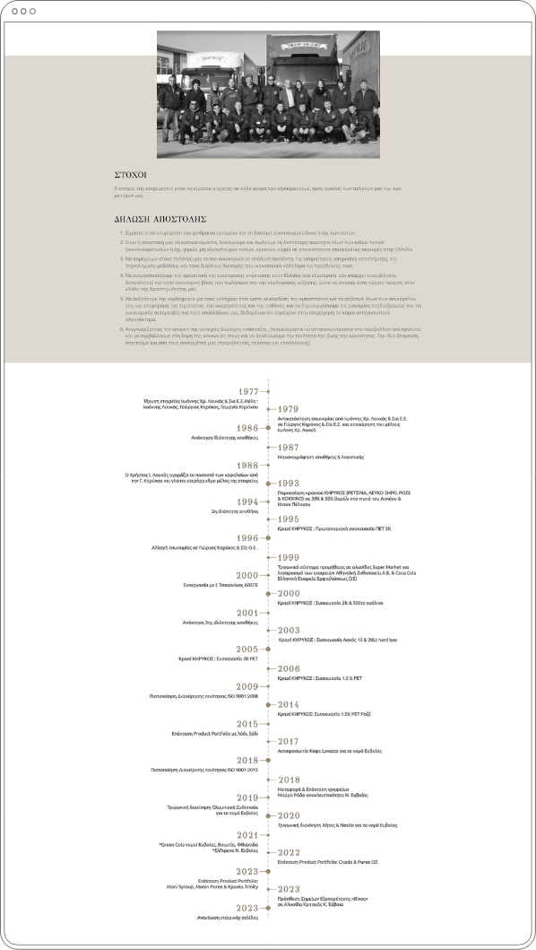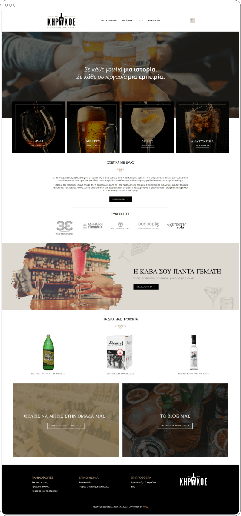 This refined brand identity extends seamlessly into the digital realm, where minimalism and balance define the user experience, ensuring Kirikos' philosophy is communicated with clarity and style. Their new website features a modern, fully functional, and responsive design, with clear navigation and a product catalogue crafted to engage users. The resulting digital transformation not only enhances user interaction but also solidifies Kirikos’ position in the beverage distribution industry.